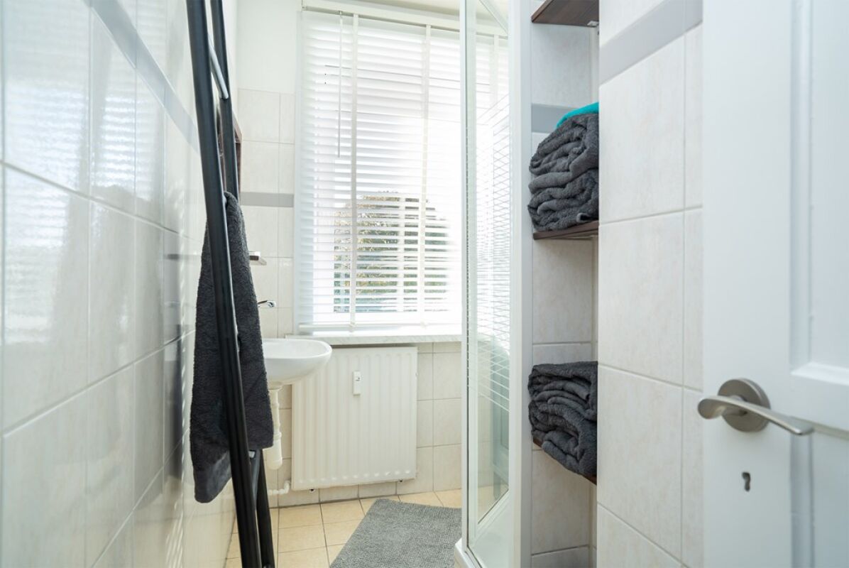 Betegeld toilet met systeemplafond. Nette badkamer met lichte betegeling, wastafel, douchehoek met scherm, systeemplafond met inbouwverlichting en kunststof kozijn met dubbel glas.