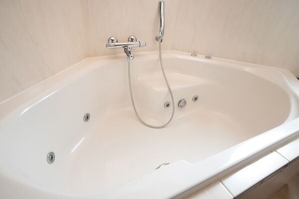 Luxe geheel betegelde badkamer voorzien van vloerverwarming, ruim ligbad(whirlpool), douche, hangend toilet en wastafelmeubel.