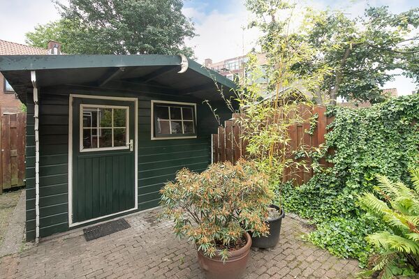 De woning beschikt over een achterom, een stenen berging voor tuingereedschap met buitenkraan en een houten tuinhuis met werkbank aan de achterzijde.