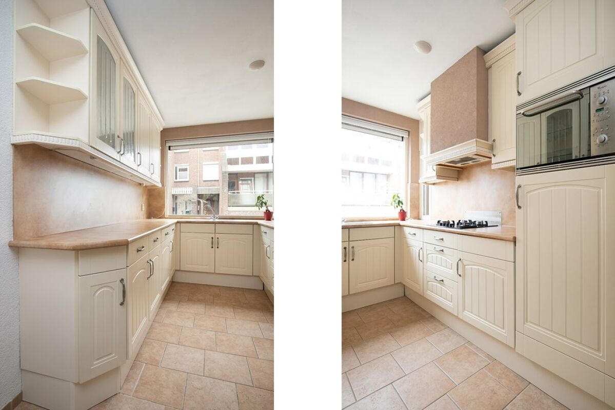 Open keuken gesitueerd aan de voorzijde met veel lichtinval voorzien van een gaskookplaat, combimagnetron, koelkast, vriezer en vaatwasmachine. De gehele begane grond is voorzien van een plavuizen vloer met vloerverwarming