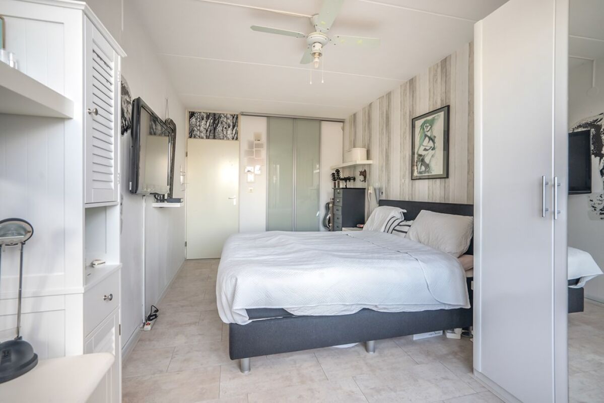 Vanuit de ruime hal voorzien van een intercomsysteem met beeldscherm bereik je verder het toilet, een gemoderniseerde badkamer, voorzien van een inloopdouche, wastafel en wasmachine aansluitingen, een grote ruime slaapkamer die goed is in te richten met daarbij een ruime inloop kleding/hangkast voorzien van glazen schuifdeuren en logeer/werkkamer naast de woonkamer die middels met glazendeuren met de woonkamer is verbonden.