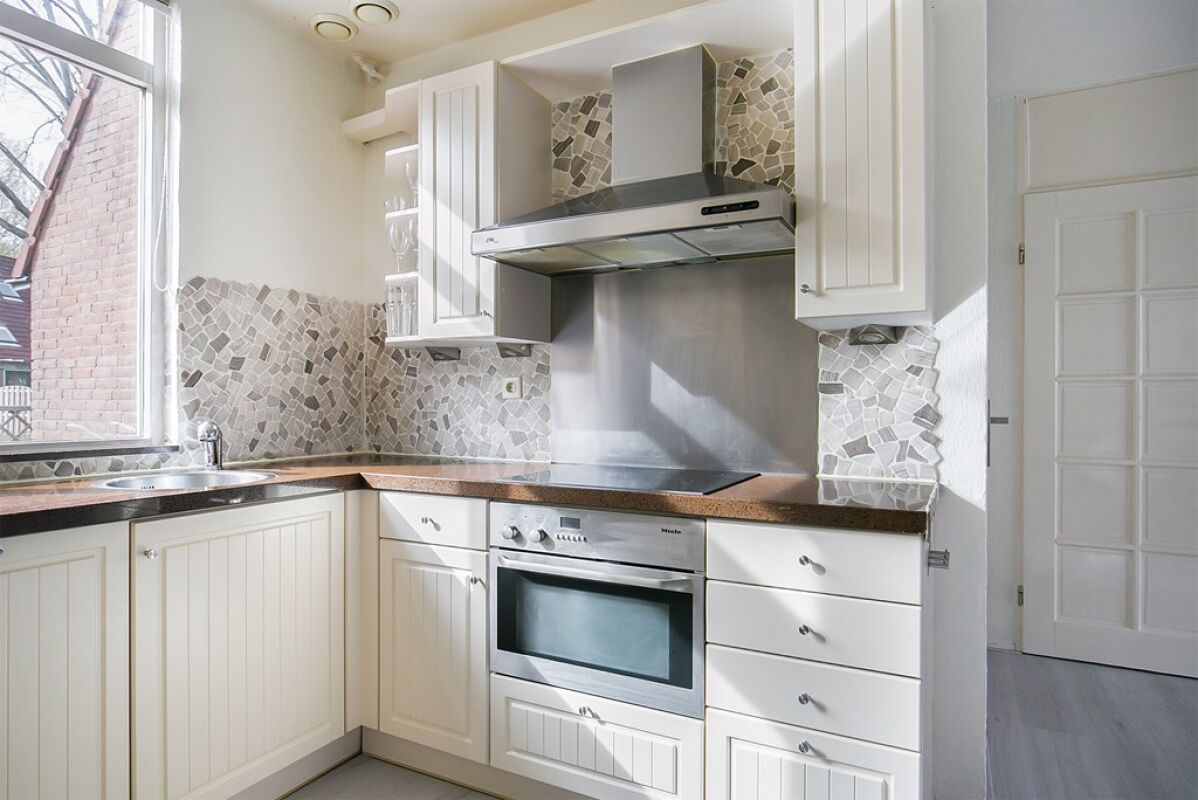 Aan de voorzijde is de open keuken in een U-opstelling met een granieten aanrechtblad, mozaïektegels op de wanden en alle benodigde inbouwapparatuur: een keramische kookplaat, afzuigkap, combi-oven/magnetron, vaatwasser en een koelkast. Door het grote raam heb je mooi uitzicht naar het groen aan de overzijde van de straat.