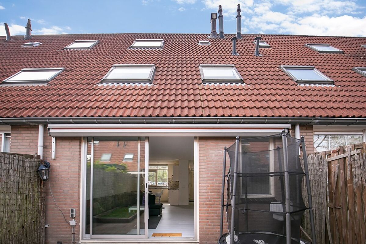Via de brede schuifpui stap je de achtertuin in; een plek waar je ’s middags en ’s avonds in de zon kunt zitten. Tegen de achtergevel hangt een zonnescherm en de rieten matten zorgen voor privacy. De tuin is voor een groot deel bestraat en de berging biedt veel praktische bergruimte.