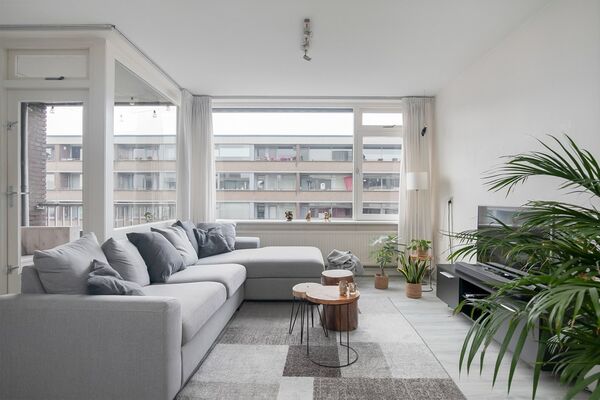 De woonkamer met halfopen keuken is een lichte, gezellige leefruimte met grote ramen aan de zuidwestkant, een deur naar het balkon en een brede kastenwand. Er is genoeg ruimte voor een hoekbank, tv-meubel, eettafel en een grote kast. Zie jij jouw meubels hier al staan?