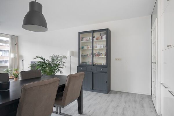 Het appartement heeft een ruime hal van waaruit de slaapkamers, badkamer, toiletruimte en de woonkamer met halfopen keuken te bereiken zijn. In nagenoeg het hele appartement ligt een nette, lichtgrijze laminaatvloer en in de hal hangt de video-intercom, waardoor je de deur op de begane grond op afstand kunt openen. Naast de meterkast is een vaste kast voor het opbergen van spullen.