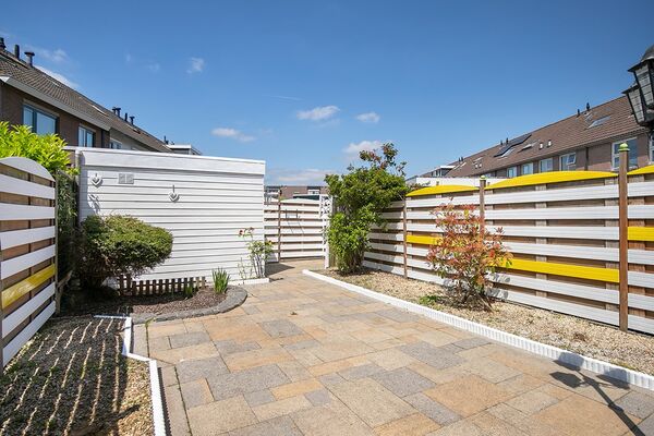 De diepe tuin is netjes onderhouden en beschikt over een achterom en een ruime vrijstaande berging.