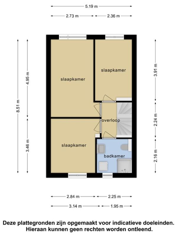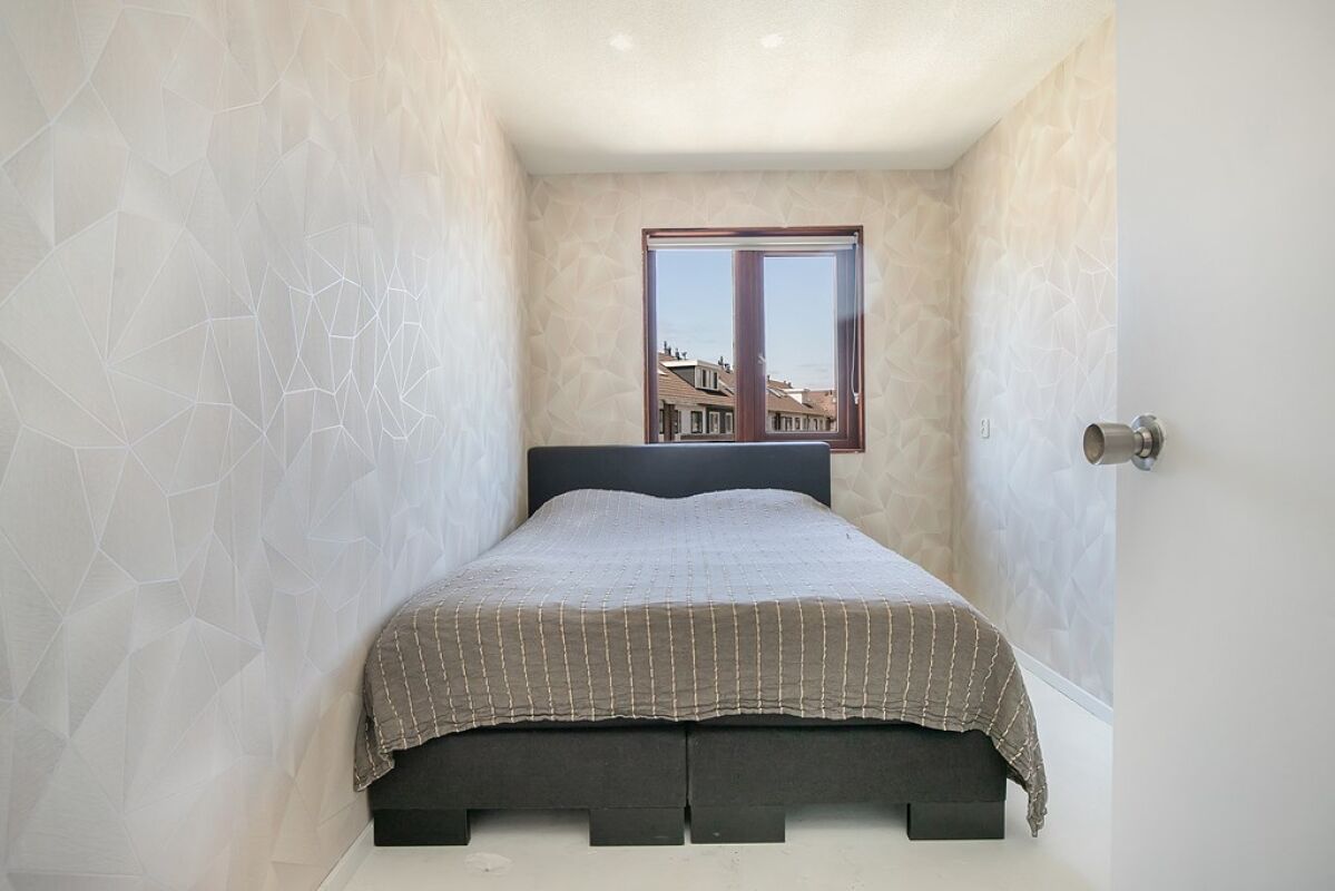 1e verdieping Overloop. Één slaapkamer aan de voorzijde van de woning en 2 ruime slaapkamers aan de achterzijde van de woning. Een vrij eenvoudige badkamer voorzien van een douche, toilet, een wastafelmeubel en aansluiting voor een wasmachine en droger.