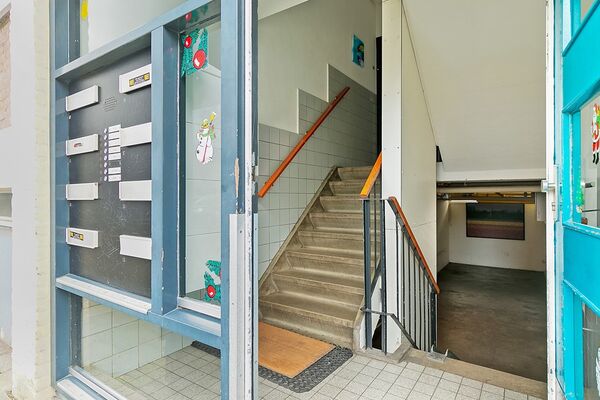 Afgesloten portiek met bellentableau, brievenbussen en berging in de onderbouw.