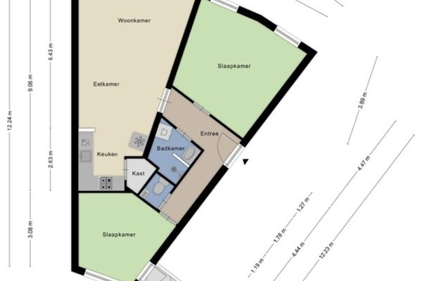 Het appartement zelf ligt op de derde verdieping van een verzorgd complex en combineert licht en ruimte met een praktische indeling. Vanuit de hal zijn alle vertrekken bereikbaar. De woonkamer is ruim en licht dankzij de grote raampartijen en biedt voldoende plek voor zowel een comfortabele zithoek als een eettafel. Aangrenzend bevindt zich de keuken, uitgerust met een oven, magnetron en gasfornuis; de vaatwasser is aanwezig, maar functioneert niet meer. Er zijn twee slaapkamers, waarvan de grootste royaal en licht is. De kleinere slaapkamer heeft directe toegang tot het balkon, zodat je hier op elk moment van de dag gemakkelijk even naar buiten kunt stappen. De badkamer beschikt over een douche en wastafel en er is een separaat toilet met fonteintje. Op de begane grond is bovendien een eigen berging aanwezig.