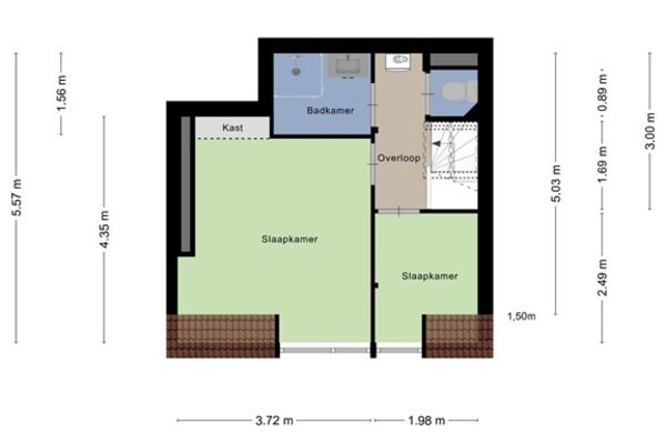 Op deze woonlaag bevinden zich twee kamers aan de voorzijde. De grootste kamer is ingericht als slaapkamer. De tweede, kleinere kamer kan worden gebruikt als tweede slaapkamer, maar leent zich ook uitstekend als werkkamer, hobbyruimte of inloopkast. In het midden van de verdieping ligt de badkamer, voorzien van een inloopdouche, wastafelmeubel, spiegelkast en designradiator. Op deze etage bevindt zich tevens een tweede toilet, een praktische toevoeging voor dagelijks gebruik. Tot slot vind je hier de cv-installatie (Intergas, 2008, eigendom en onderhouden in 2024).