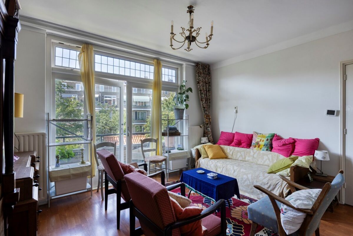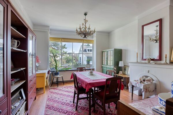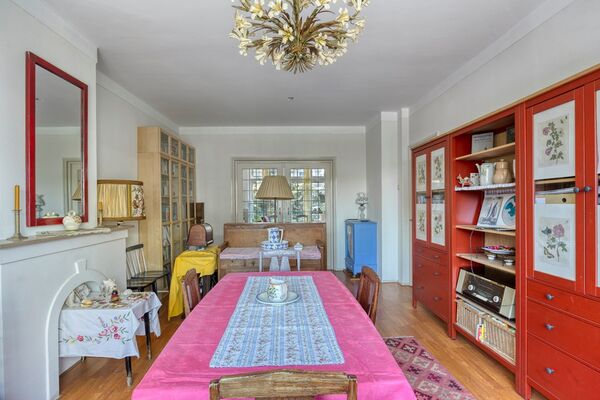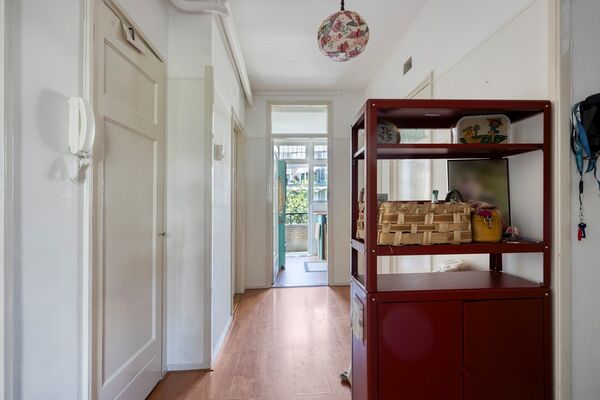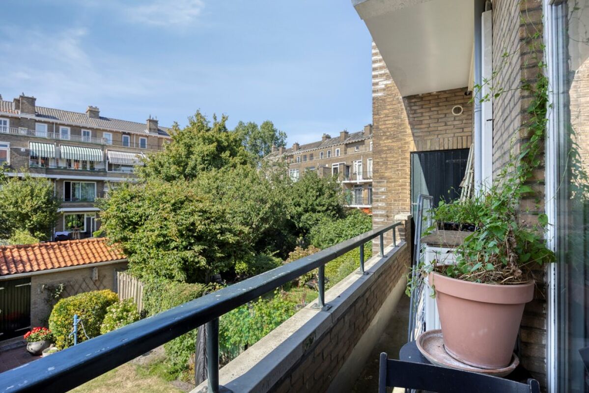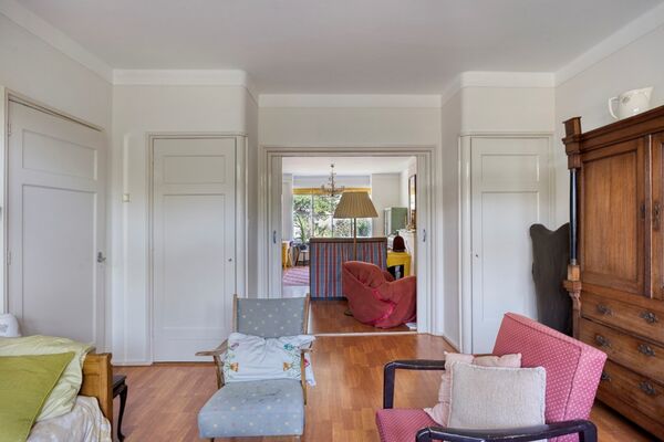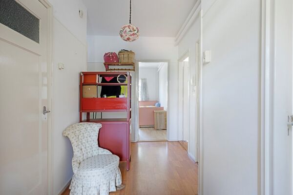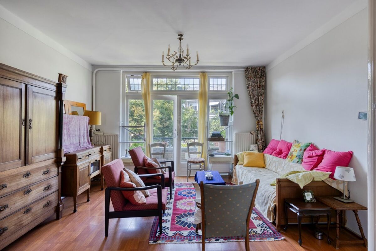 Via het afgesloten portiek met brievenbussen en bellentableau bereikt u het trappenhuis dat toegang geeft tot de eerste etage. De woning opent in een ruime hal met meterkast en deurintercom. Aan de voorzijde bevindt zich een lichte eetkamer met vrij uitzicht over het groen. De royale woon- en eetkamer strekt zich uit over de volledige diepte van de woning en heeft een klassieke suiteseparatie met vaste kasten. Aan de achterzijde geven dubbele openslaande deuren toegang tot het brede balkon, waar u de middag- en avondzon kunt genieten.