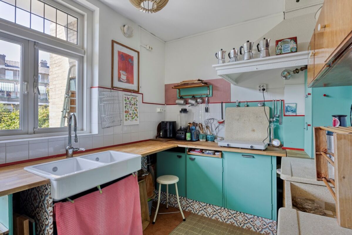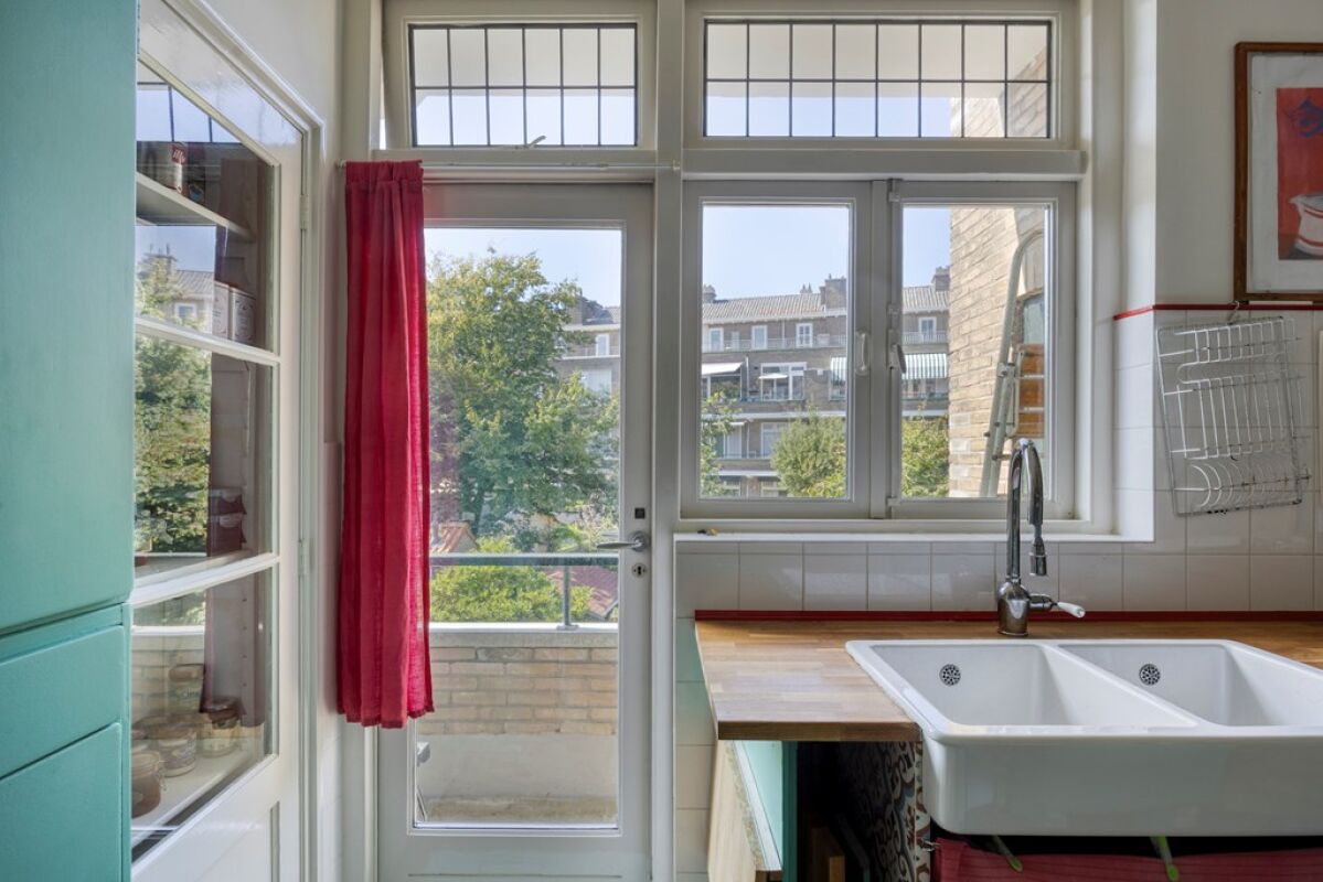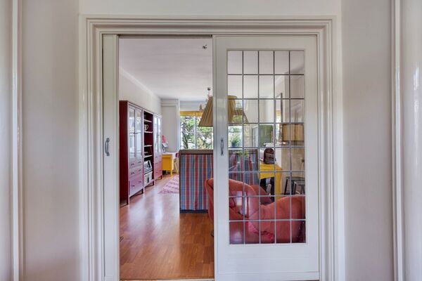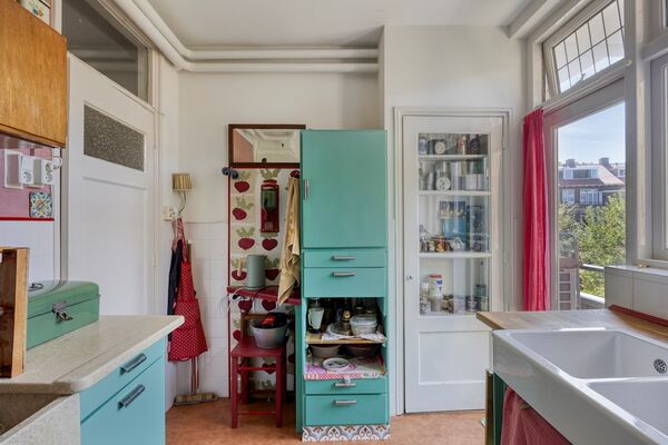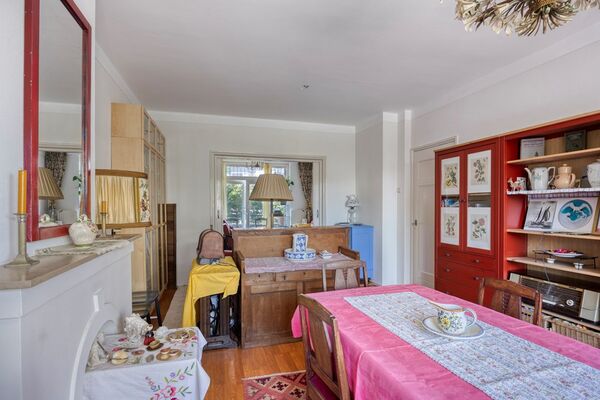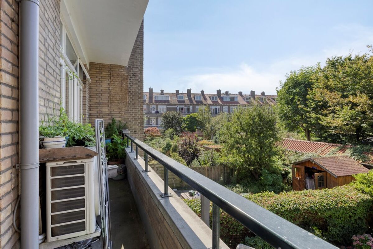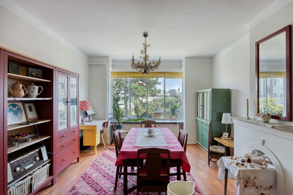 Via het afgesloten portiek met brievenbussen en bellentableau bereikt u het trappenhuis dat toegang geeft tot de eerste etage. De woning opent in een ruime hal met meterkast en deurintercom. Aan de voorzijde bevindt zich een lichte eetkamer met vrij uitzicht over het groen. De royale woon- en eetkamer strekt zich uit over de volledige diepte van de woning en heeft een klassieke suiteseparatie met vaste kasten. Aan de achterzijde geven dubbele openslaande deuren toegang tot het brede balkon, waar u de middag- en avondzon kunt genieten.