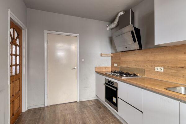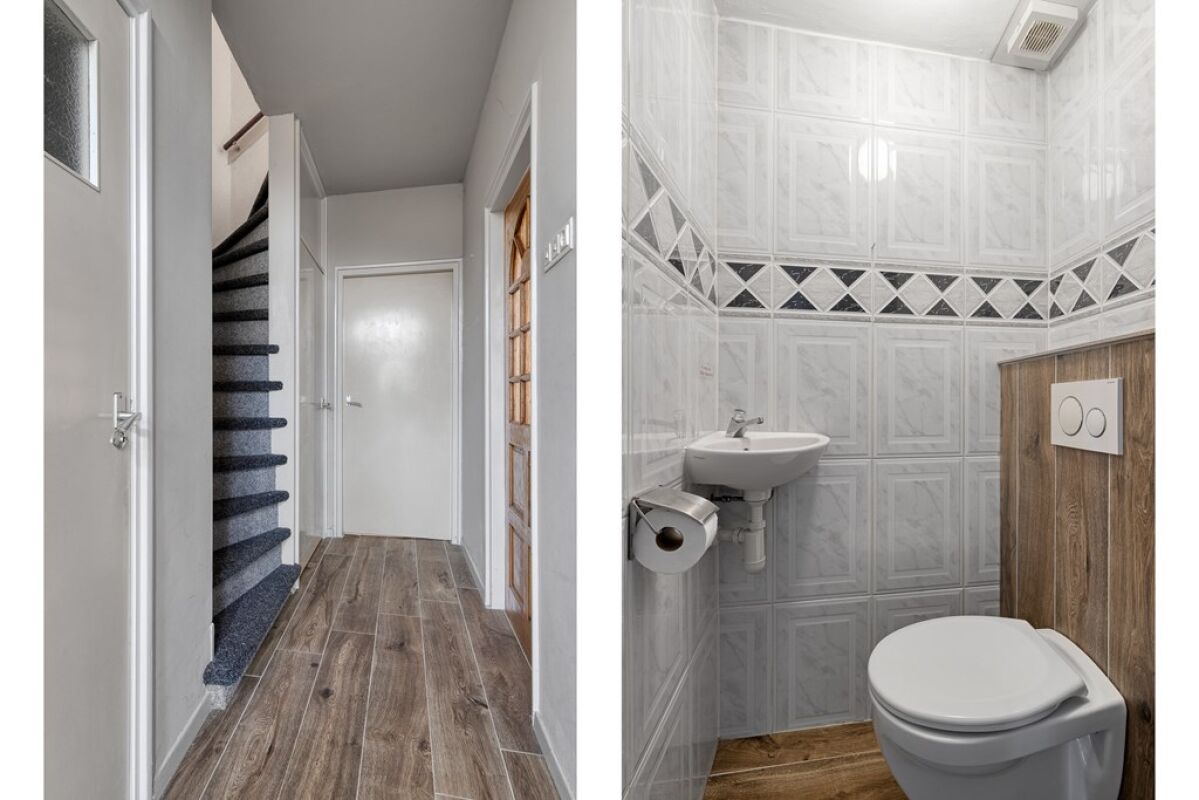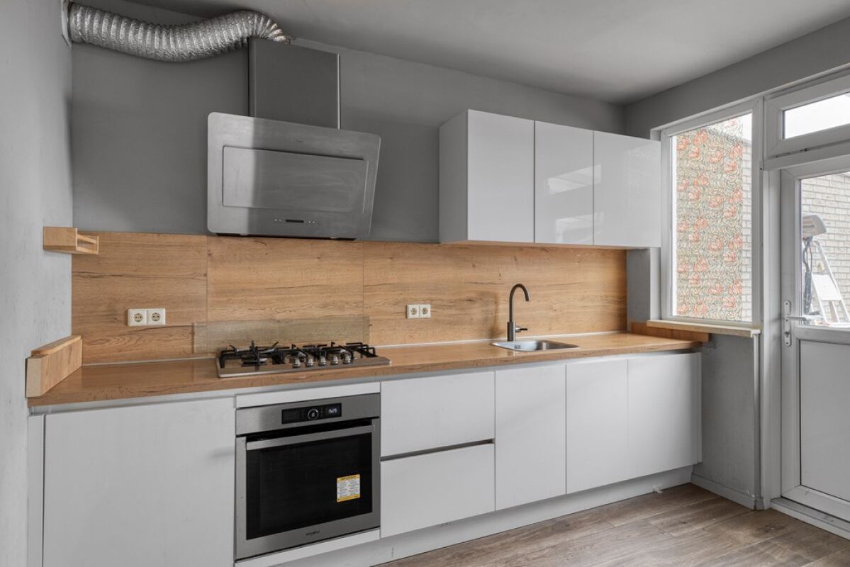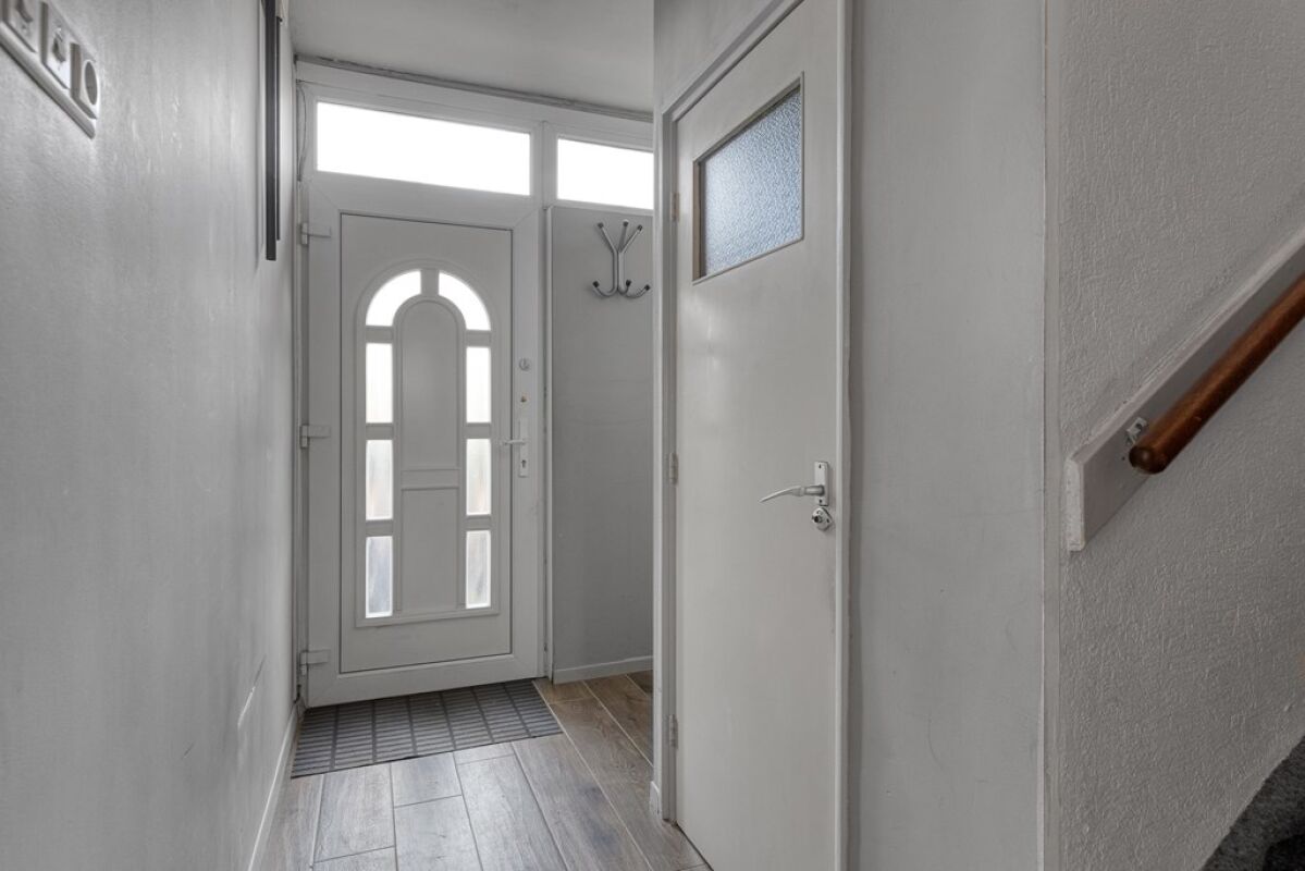 Via de entree kom je binnen in de hal, waar zich het toilet, de trapopgang en de doorgang naar de keuken en woonkamer bevinden. De keuken is ingericht met diverse inbouwapparatuur, waaronder een gaskookplaat, oven, afzuigkap, vaatwasser en een inbouwkoelkast met vriezer.