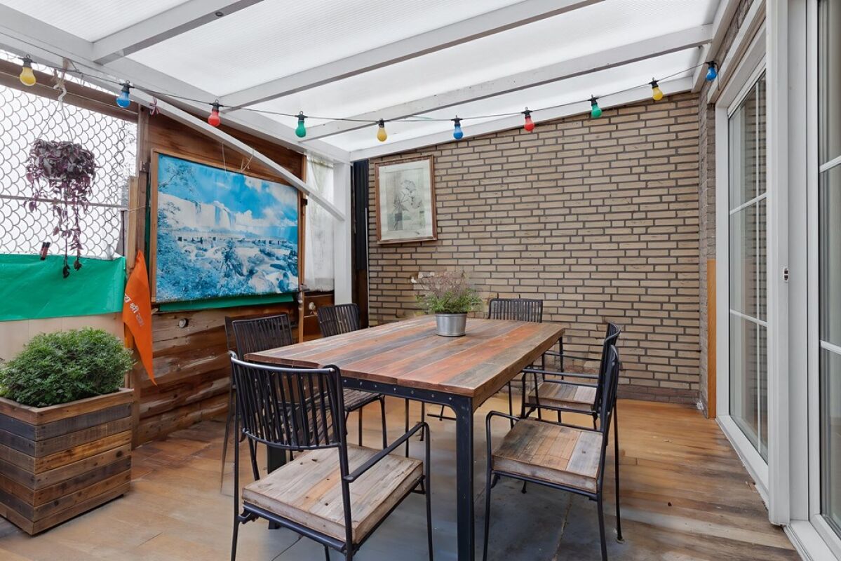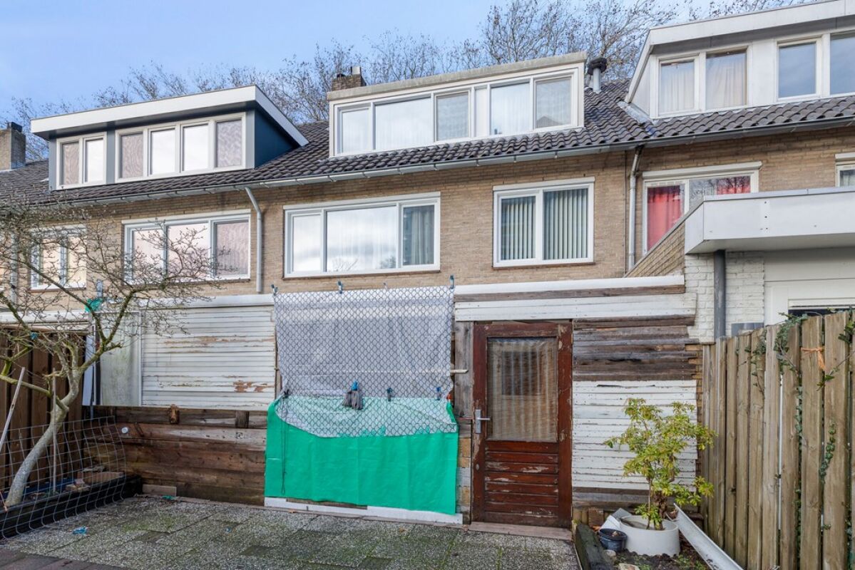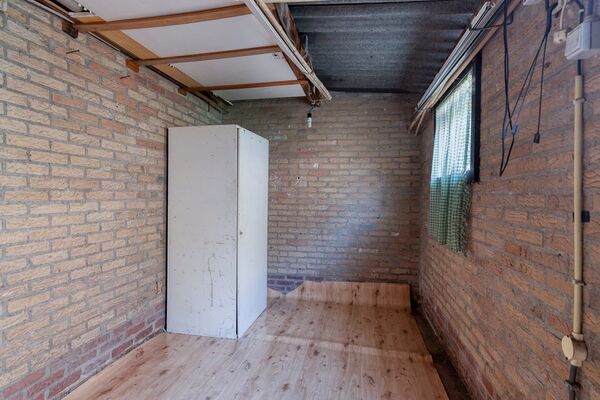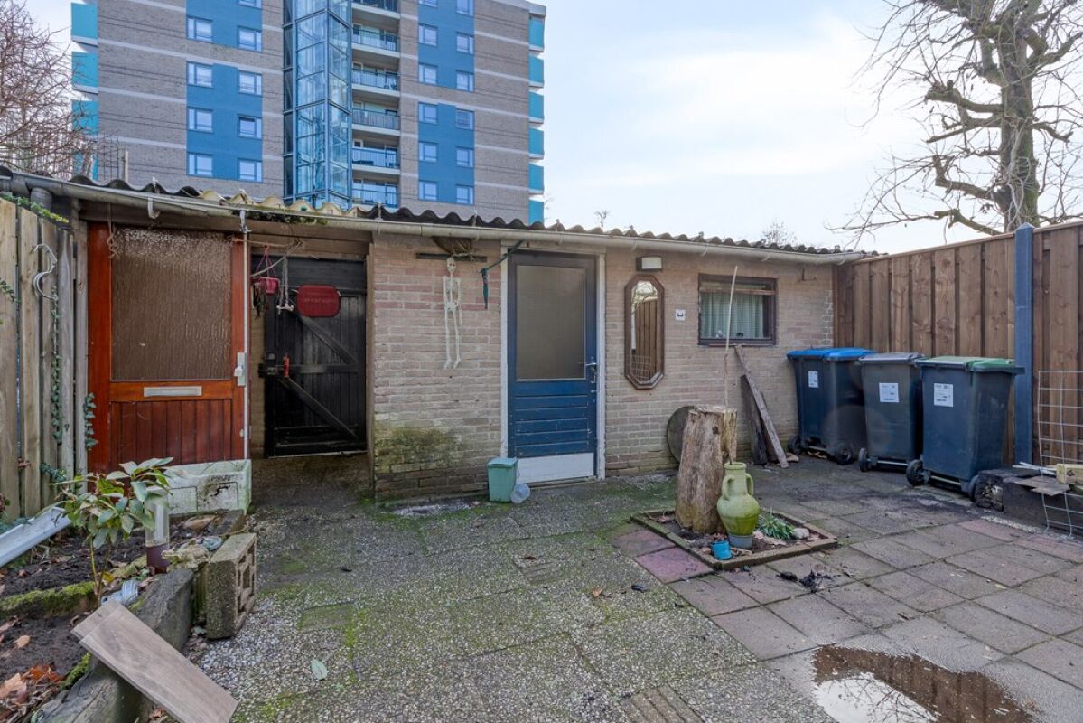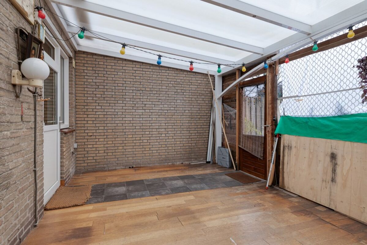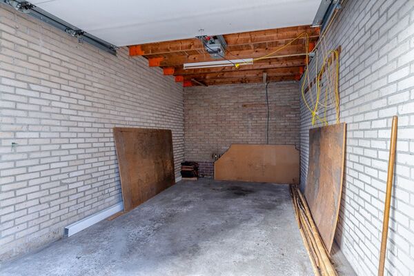De achtertuin beschikt over een overkapping en biedt toegang tot een vrijstaande berging. Achter in de tuin bevindt zich tevens een garage, geschikt voor het parkeren van een auto, het stallen van fietsen of het creëren van extra opslagruimte.