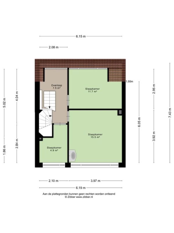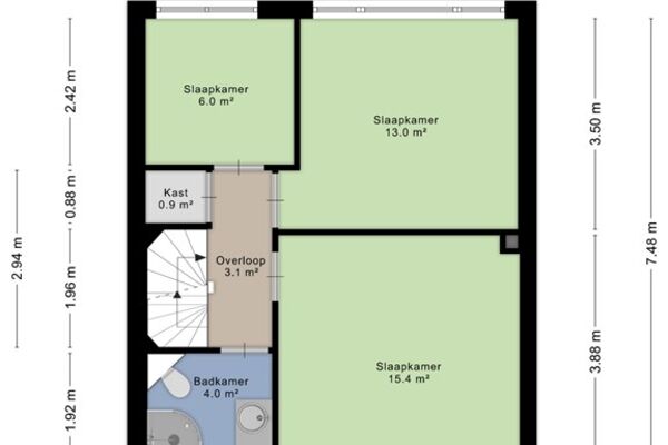 De tweede verdieping bevinden zich drie kamers van verschillende afmetingen waarvan twee volwaardige slaapkamers en een ruime overloop. Door de indeling en het beschikbare dakoppervlak is deze verdieping goed te gebruiken voor extra slaap-, werk- of hobbyruimtes.
