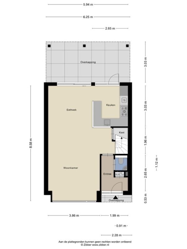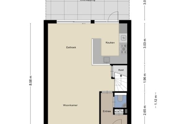 De entree geeft toegang tot de hal met toilet, waarna je direct de ruime doorzonwoonkamer binnenstapt. De trap bevindt zich in de woonkamer, wat zorgt voor een logische indeling en een prettig ruimtelijk gevoel. Dankzij de grote raampartijen voelt de woonkamer licht en uitnodigend aan, met voldoende plek voor zowel een royale zit- als eethoek.