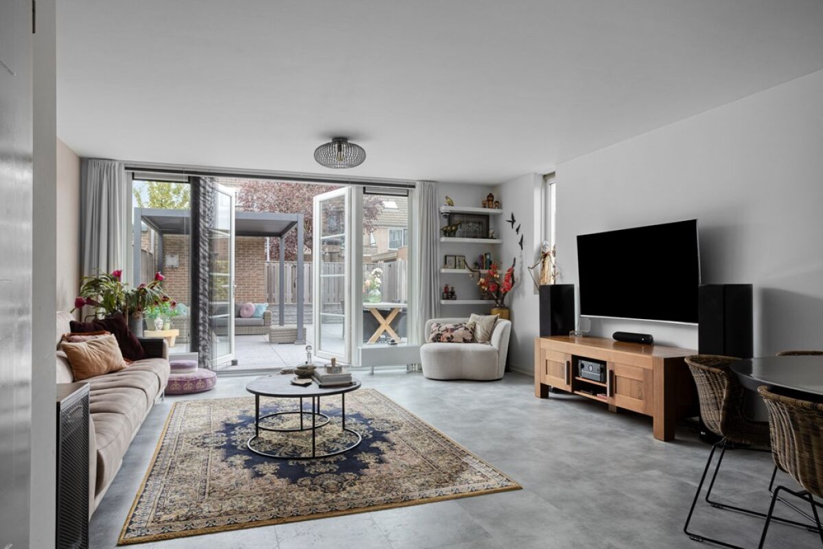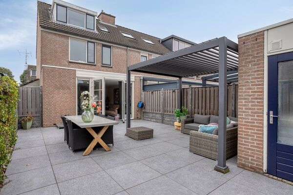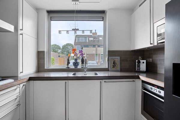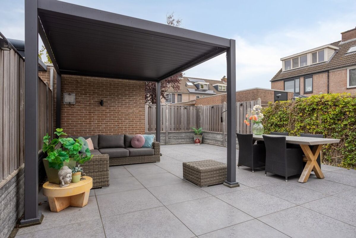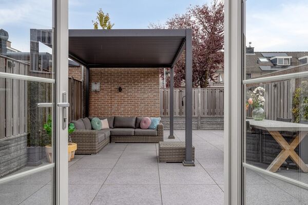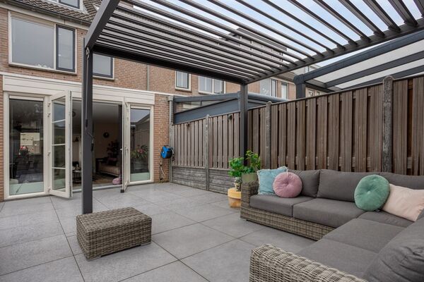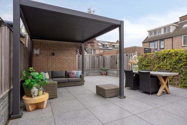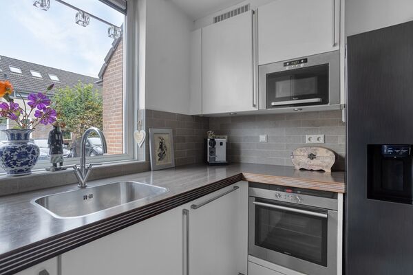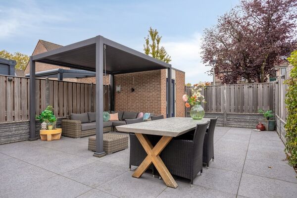 Via de openslaande deuren bereikt u de onderhoudsvriendelijke tuin met moderne overkapping en vrijstaande berging, een fijne plek om te ontspannen of samen te eten op zomerse dagen. De keuken aan de voorzijde is compleet uitgerust met een vaatwasser, heteluchtoven, 5-pits gasfornuis, afzuigkap en magnetron, een praktische en prettige ruimte voor wie graag kookt.