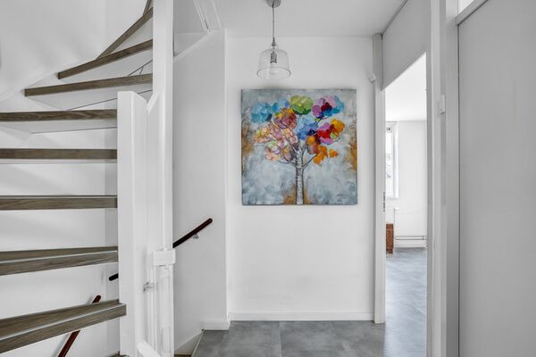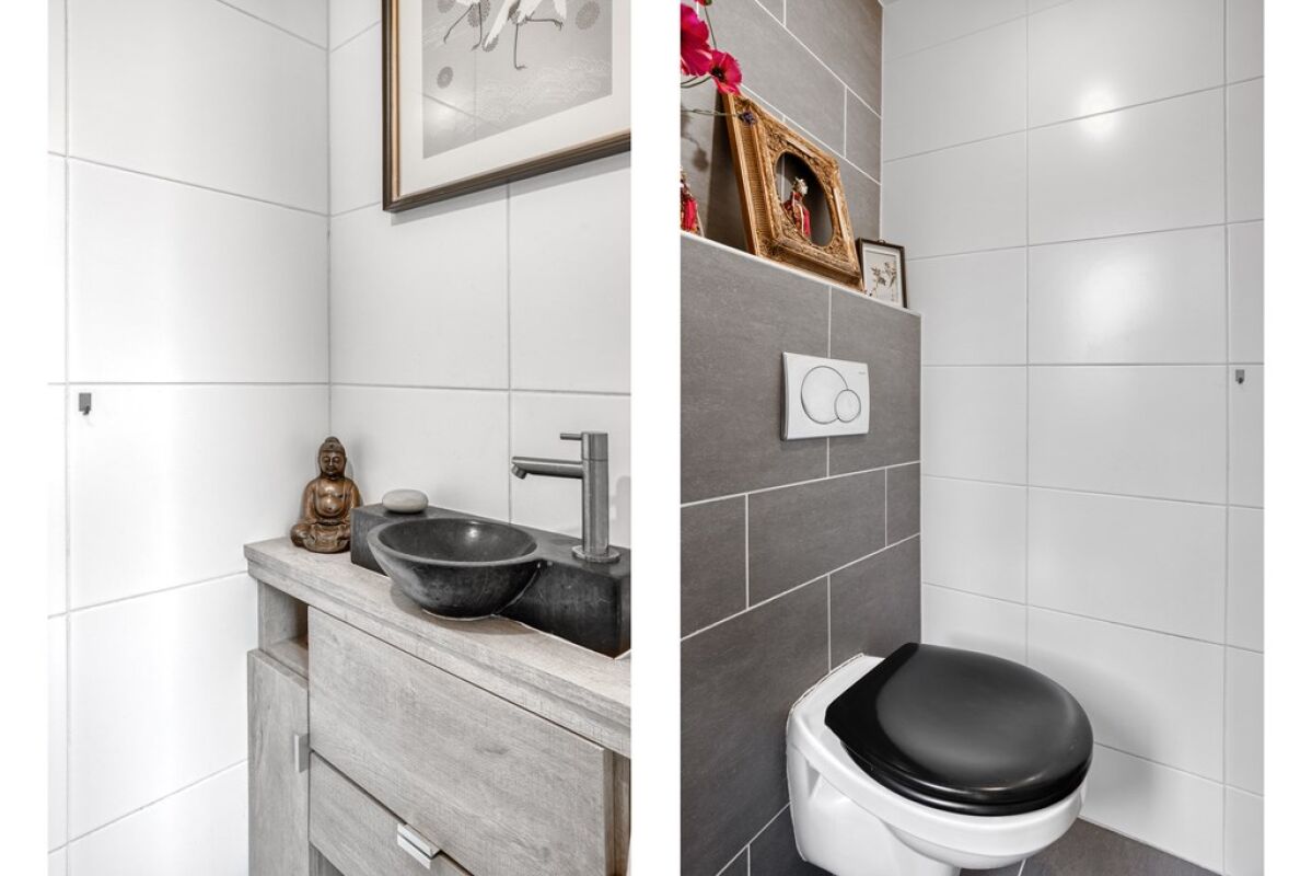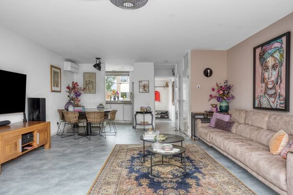 De begane grond straalt rust en comfort uit. De royale woonkamer met open eetgedeelte ontvangt veel natuurlijk licht en is uitgerust met een airco-installatie, waardoor het in elk seizoen aangenaam vertoeven is. De moderne PVC-vloer loopt naadloos door over de gehele begane grond en eerste verdieping, terwijl ook de trappen hiermee zijn bekleed. Dit zorgt voor een stijlvolle, uniforme uitstraling en is bovendien praktisch in onderhoud.